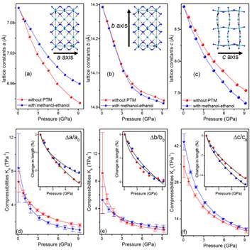 为了探索Hofmann包合物中去组装过程是否在高压是可逆的,即高压是否可以导致主体框架和“外界”客体分子之间的组装过程,该课题组对NiHofmann包合物对应的主体框架Ni(CN)4Ni(NH3)2?0.5H2ONi-Ni)进行了高压同步辐射实验,通过不添加、添加不同“外界”客体分子两种情况的实验,对比探索该物质在高压下的结构行为,主客体组装关系变化的差异。获得更多的压力对主客体组装调制,客体对主体框架的影响等方面的具体信息。如果在高压下“外界”ME可以进入主体孔隙,在有客体分子支撑的情况下,层间的压缩会更难。在以醇分子作为“外界”客体分子的的情况下,a轴的收缩被抑制,而层间结构的压缩反而更为明显,实验现象则表明,高压下小分子ME并未进入到Ni-Ni的孔隙中