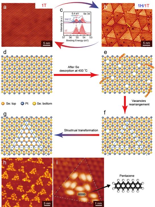 中科院物理研究所高鸿钧院士领导的联合研究团队在新型二维原子晶体材料及其功能化的研究中获得了突破性进展[Nature Materials 16, 717 (2017)]。他们发展了一种构建纳米级精准规则图案的方法,首次构筑了两种基于过渡金属硫族化合物的“纳尺度的自然图案”材料:一种是具有交替三角形拼图图案的1H/1T型单层二硒化铂(1H/1T-PtSe2),另一种是具有周期排列三角形孔洞的单层硒化铜(CuSe)。进一步将分子和原子分别沉积到这两种材料表面的实验显示这两种二维原子晶体材料具有选择性功能化的特性。单层二硒化铂(PtSe2)具有两种构型,八面体型(1T)和三棱柱型(1H)。在此工作之前,2015年该研究组利用直接硒化 Pt(111)基底的方法,制备出了高质量半导体性质的1T型单层二硒化铂(1T-PtSe2)单晶薄膜[Nano Lett. 15, 4013 (2015)]。在此工作基础上,他们通过对1T型单层二硒化铂薄膜(1T-PtSe2)进行退火处理(基底400℃),使其表面形成硒原子空位缺陷,空位缺陷重新排列得到了三角形图案化的1H/1T-PtSe2单层薄膜。进一步对1H/1T-PtSe2薄膜补充硒原子并在较低温度下(基底 270℃) 退火,可以获得纯的1T-PtSe2薄膜,从而实现了1H/1T-PtSe2薄膜和1T-PtSe2薄膜之间的可逆转变。1T结构具有半导体性质,1H结构具有金属性质;1T/1H结构之间的界面原子级平整,可提供未来器件应用中理想的金属-半导体结构。此外,类似于传统半导体中的掺杂工艺,可以使半导体1T区域表现为电子富集(N型)或者缺乏(P型)。比如,沉积的并五苯(C22H14)分子只吸附在1H区域,这可能会改变这些金属性的区域,由此导致相邻的半导体性1T区域的电子增加或者减少,即实现掺杂。为了验证该材料潜在的功能化特性,他们将并五苯(Pentacene)分子沉积到1H/1T-PtSe2表面,发现并五苯分子选择性吸附在三角形的1H-PtSe2区域。