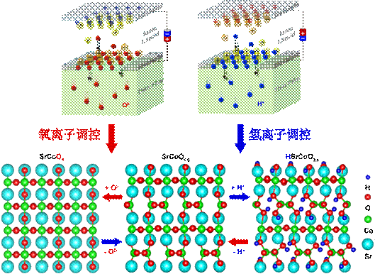 图1 通过电场控制的氧离子(O2-)和氢离子(H+)的调控,可以实现SrCoO3-δ, SrCoO2.5和HSrCoO2.5三相之间的可逆相变。