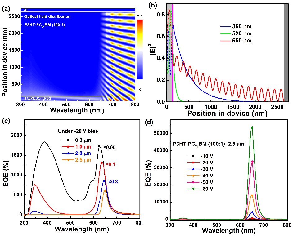 在北京同步辐射装置(BSRF)光电子能谱实验站(4B9B)验证了器件活性层经过较短自组装时间可以使得Al电极附近保持较大的PCBM含量,进而增强了电子诱导的空穴隧穿注入,极大的提高了器件的响应度。随后,该研究组通过模拟器件ITO/PEDOT:PSS/P3HT:PCBM (100:1)/Al中的光场分布发现,当活性层厚度增加到2.5 μm时,在短波段(< 630 nm)的入射光可以被活性层完全吸收,而长波段(>630 nm)的入射光则可以到达铝电极,从而使入射光与经铝电极的反射光在活性层中形成稳定的干涉现象。通过制备一系列不同厚度活性层的器件并表征其在-20 V偏压下的EQE发现,活性层厚度增加到2.5 μm时,器件在短波段几乎没有响应,只在长波段650 nm附近有较窄的响应,其FWHM只有27 nm,且650 nm处的EQE值为600%,成功实现了窄光谱响应的光电倍增型有机光电探测器。逐渐增大外加偏压到-60 V,其最大EQE值达到了53500%,抑制比(650 nm与520 nm处的EQE比值)达到了2020,更重要的是,响应光谱的FWHM并不随偏压的增大而展宽,仍然可以维持在小于30 nm。此外,少量的PCBM限制了陷阱电子在活性层的传输,使得P3HT:PCBM (100:1)器件在大偏压下仍然可以保持窄带响应,证明了其在窄带探测方面的潜在应用价值。近期,研究人员在此项研究成果基础上,成功制备出双向(正/反偏压、顶/底入射)响应倍增型有机光电探测器,器件在不同的工作模式下分别具有超宽/超窄响应特性。这种三明治结构的器件有利于将其集成在光电系统中,有望推动有机柔性集成光电子产业的发展。