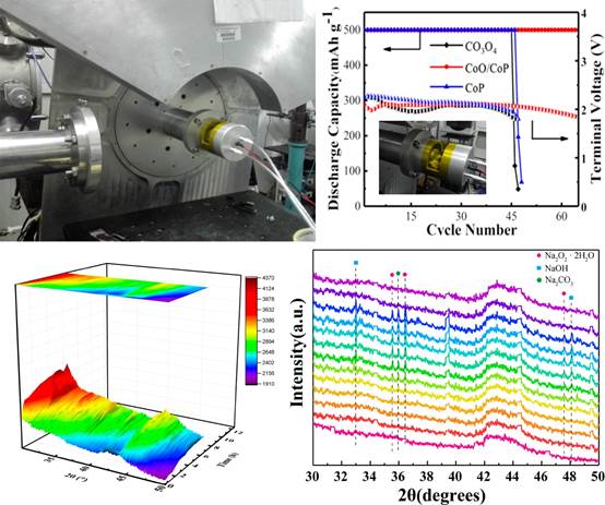 图1 基于同步辐射的原位电化学衍射装置(左上),Co3O4, CoO/CoP和CoP催化的Na-O2电池的电化学性能(右上)及其三维(左下)和二维(右下)原位 XRD 图。