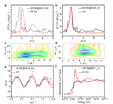 图1. (a) MCM@MoS2-Ni和Ni箔的Ni K边EXAFS光谱;(b) MCM@ MoS2-Ni的R空间中的实验和拟合的EXAFS光谱能够很好的吻合; (c) MCM@ MoS2-Ni的k3加权EXAFS信号小波变换;(d) Ni箔的k3加权EXAFS信号小波变换;(e) MCM@MoS2-Ni在K空间中的实验和拟合EXAFS光谱能够很好的吻合;(f) MCM@MoS2-Ni和Ni箔的实验XANES光谱。