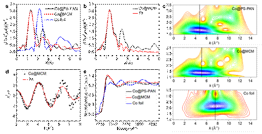 图1. (a) Co@PS-PANCo@MCMCo箔的Co K-EXAFS谱图。(b)实验EXAFS光谱在K空间中的傅里叶变换以及Co@MCM的最佳拟合结果。(c) Co@PS-PANCo@MCMCo箔的小波分析衍射图谱。(d)R空间中EXAFS谱的傅立叶变换以及Co@MCM的最佳拟合结果。(e)Co@PS-PANCo@MCMCo箔的Co K-edge XANES实验光谱