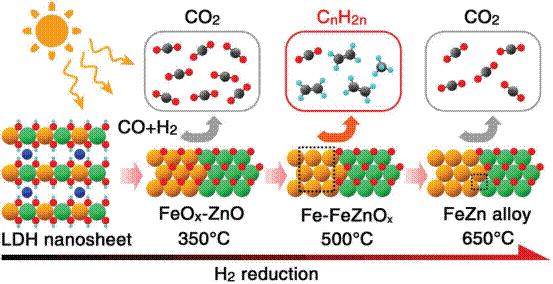 低碳烯烃作为一种重要的现代化工原料,被广泛地应用在诸多领域,如聚合物的合成,药物的合成以及其他一些特殊化工品。而目前制备低碳烯烃的手段主要是依靠以合成气为原料的费托合成和以甲醇为原料的MTO反应,虽然上述两种反应可以通过优化催化剂的方法得到高选择性的目标产物,但通常都需要高温(400)高压(1-3Mpa)的严苛的反应条件,这无疑增加了反应的成本。因此,寻找一种能在温和条件下制备低碳烯烃的方法成为当下研究的热点。中国科学院理化技术研究所超分子光化学中心的一个团队通过氢气还原水滑石材料的方法得到了一种铁基的异质结构,该材料在可见光作用下有效地驱动了CO加氢制备低碳烯烃的反应,相关研究成果发表在201896日的Advanced Materials上。