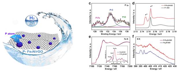 该研究组采用简单的低温磷化方法制备了生长有无定型磷化铁包覆的氮化铁纳米颗粒的还原氧化石墨烯复合材料(P-Fe2N-rGO),在研究工作中,北京同步辐射装置和上海光源帮助该研究组证实了无定型的FexP层存在。磷化铁层的存在既提高氮化铁材料在酸性电解液中的稳定性,也为材料提供了更多的催化活性位点,功函和理论计算结果都证实该材料具有类铂的结构以及电化学析氢反应催化特性。将其作为电化学析氢反应的催化剂,该材料在酸性条件下具有较低的过电势和塔菲尔斜率,并且具有优异的循环稳定性,有希望成为替代贵金属的析氢反应催化剂。