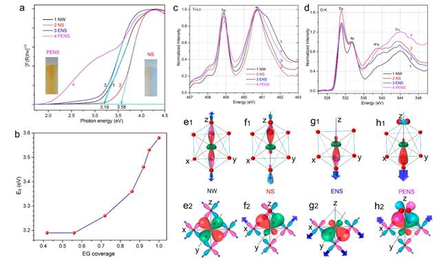 1. NEXAFS表征乙二醇配体诱导的TiO2纳米片表面轨道重构机制。