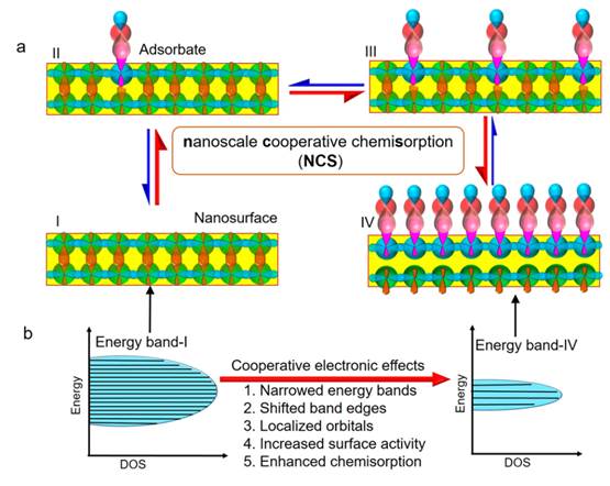 3.作用结果: (1)对纳米材料,表面价原子轨道被极化再分配到表面化学键中,该过程使得能带的强度降低,导致相应能带的宽度变窄,能带边的位置发生移动,能带内的态密度进一步量子化,表面原子的反应活性进一步提高。这种内在电子结构的变化深刻影响着纳米材料的光、电、磁及催化等物理与化学性质,此为纳米材料表面效应的电子本质。(2)对配体分子,化学吸附的强度既是表面活性的度量,又是吸附态稳定性的度量。该强度随着覆盖度的增加而增强,这种正相关效应导致纳米材料表面一旦被配体吸附就将自发实现吸附饱和。