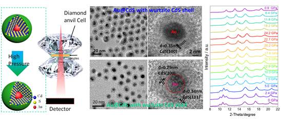 无机纳米材料的物相、形貌、异质界面等在高压条件的稳定性及相变,对高压下的应用如高压传感器等应用具有重要的科学意义。CdS、CdSe等纳米晶(量子点)在高压下呈现新颖的相变过程并被广泛研究。异质结构纳米晶,尤其是各向同性的量子尺寸核壳纳米晶在高压条件下的相变、异质界面及纳米效应研究具有重要的科学意义,少有报道。北京理工大学结构可控先进功能材料与绿色应用北京市重点实验室张加涛教授团队利用原创性的非外延生长法制备了具有单晶CdS壳层的Au@CdS金属半导体核壳纳米晶(Science 2010, 327, 1634;Angew. Chem. Int. Ed. 2015, 54,3683;Adv. Mater. 2014, 26, 1387;Adv. Mater. 2016, 28, 3094)。他们与Beijing Synchrotron Radiation Facility (BSRF)的李晓东研究员,郑黎荣研究员等合作,对其在高压下的原位相变等进行了深入研究,相关的研究成果发表在2018年的《Journal of the Physical Chemistry Letters》杂志上。