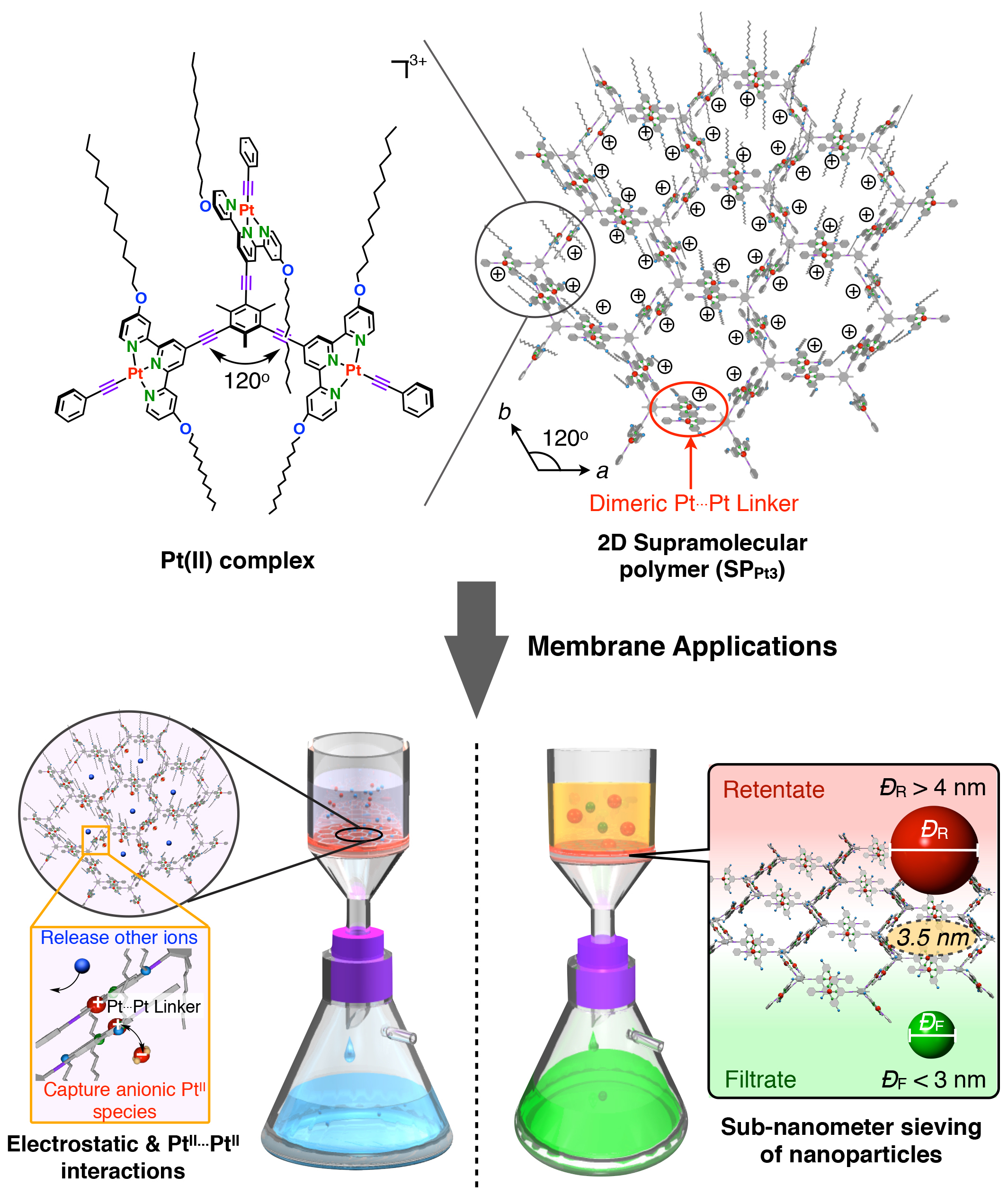 从废水中回收贵金属铂是一项兼具环保和经济价值的任务。目前,能够实现针对铂的高选择性是非常困难的,因为它与钯、金、银等其他贵金属具有某些相似的化学性质。作者所制备的二维超分子聚合物是由带正电的三联吡啶铂配合物组装形成,显示出独特的···非共价键相互作用。正是凭借这类铂自身的相互作用和静电吸引,四氯铂酸根阴离子会很容易在过滤中被超分子聚合物膜捕获;相反,其他金属离子会非选择性地快速渗透通过膜孔,最终实现对铂的高效分离回收。在上述工作基础上,研究人员还进一步探索了该膜材料对于不同纳米尺寸粒子的分离。由于二维超分子聚合物内存在均一且平行取向的纳米空腔,该复合膜在截止尺寸约4.0nm精度上显示出高的尺寸选择性。理论上讲,该膜可分离的粒子种类是不限的,包括量子点、贵金属和金属氧化物。研究人员结合该超分子膜和过滤分离,不仅仅提高了纳米粒子的红光发光纯度和尺寸单分散性,而且还能够快速去除难以被磁体捕获的较小磁性粒子吸附剂,从而扩展了它们在许多领域中的潜在应用。