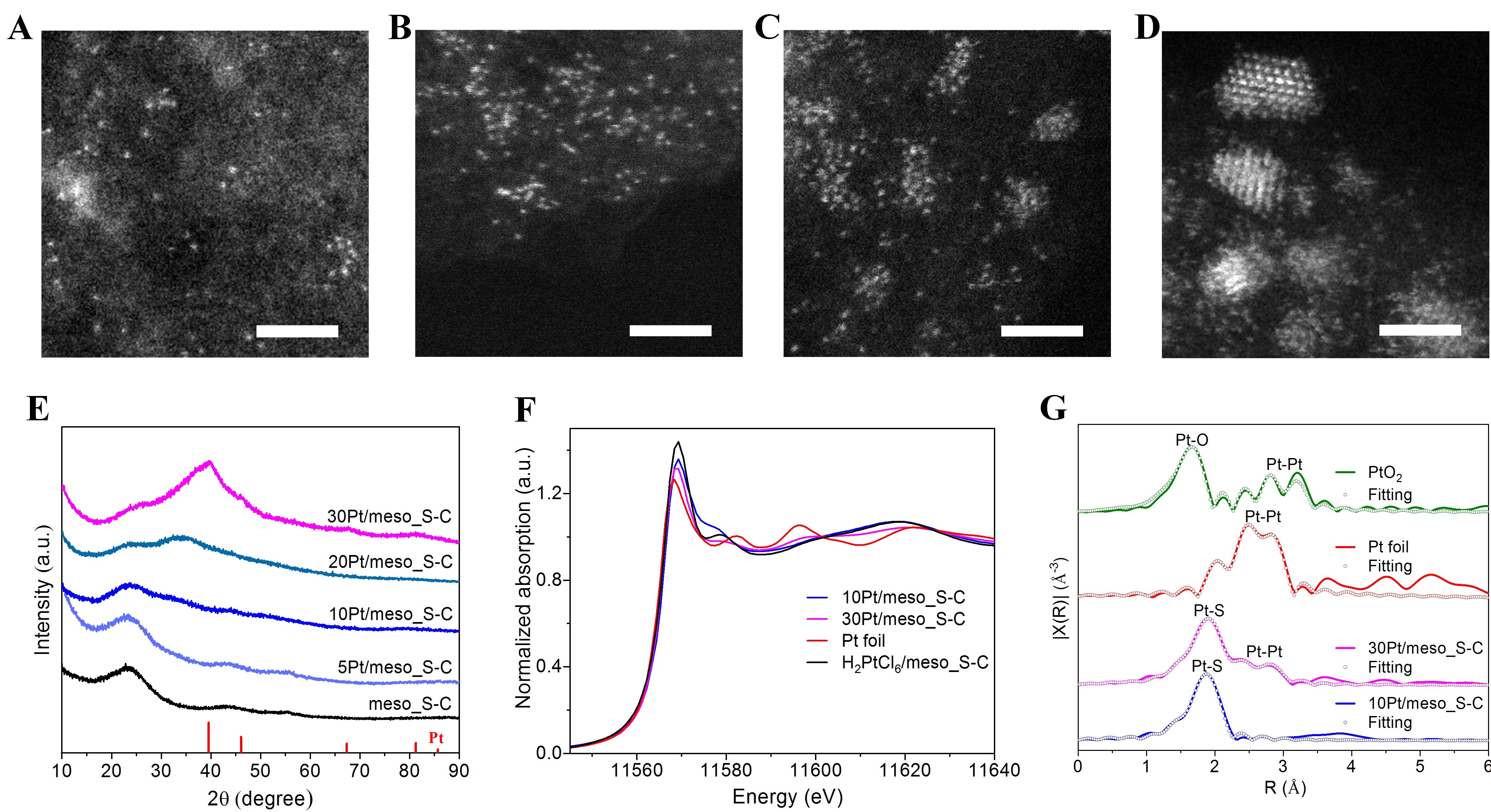 从球差校正透射电镜图来看,当金属Pt载量小于10%时未发现纳米颗粒或纳米团簇存在(图2A-B),而在20Pt/meso_S-C和30Pt/meso_S-C(图2C-D)催化剂中很明显观察到团簇或纳米颗粒。X-射线吸收精细结构谱(XAFS)是表征原子分散催化剂的最强有力的手段之一。如果样品中金属以原子形式分散在载体表面就不会有金属-金属键存在,反之样品中若有金属团簇或颗粒存在就能检测到金属-金属键。研究人员依托北京同步辐射装置1W1B-XAFS实验站获得的X射线近边吸收精细结构(XANES)表明,Pt/meso_S-C中的Pt处于氧化态(图2F)。扩展X射线吸收精细结构(EXAFS)结果表明(图2E),10Pt/meso_S-C,在2.5-2.8埃范围内没有出现Pt-Pt键的峰,而在1.8-2.0埃处很明显观察到Pt和其他元素的配位键。与PtO2相比,该峰的位置要比Pt-O键更长,因此该峰可归属为Pt-S键。拟合结果表明,当Pt载量小于10wt%时,只有Pt-S键存在(配位数CN=3.6),没有Pt-Pt键,证实了Pt催化剂以原子分散的形式分散在meso_S-C上,同时验证了金属与硫的键合作用。随着Pt金属载量的提高,Pt-S配位数降低,同时Pt-Pt键的配位数增加。此外,随着Pt含量的升高,Pt-Pt键的键长逐渐升高(从2.717埃到2.763埃),且比Pt片中Pt-Pt键的键长(2.763埃)短,说明Pt原子从无序到有序变化这一过程。