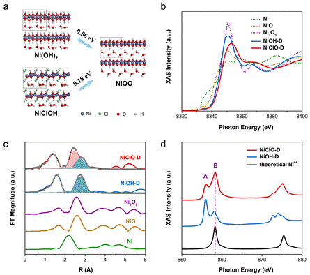 利用北京同步辐射装置(BSRF1W1B-XAFS实验站X射线吸收谱学实验证实了所合成的Ni4+催化剂(NiClOH-derived, NiClO-D)和Ni3+催化剂(Ni(OH)2-derived, NiOH-D)的电子结构。与Ni3+催化剂,Ni4+催化剂的中心Ni金属的价态更高,导致Ni-O的共价性更强,从而促使了晶格氧交换反应路径的产生。催化剂的中心金属价态的提高,不仅可以提高催化反应速率,还可以改变催化反应路径。
