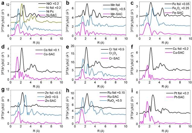 利用北京同步辐射装置(BSRF1W1B-XAFS实验站获得的九种单原子催化剂EXAFS R空间图。九种单原子催化剂在对应的金属键处均没有出现明显的峰,表明在催化剂中没有形成M-M键,并且均在1-2?之间出现了一个峰,对应于M-N键,表明在所合成的九种催化剂中金属原子均与氮配位形成了单原子催化剂。