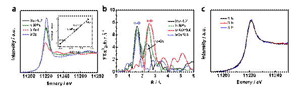 1. (a,b) 单原子Ir催化剂的X射线吸收谱(XAS)。(c) 单原子Ir催化剂在电催化还原CO2反应过程中,不同反应时间IrX射线吸收近边结构谱图(XANES)。