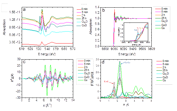 3. Cu-Cu2O-1电催化剂在CO2还原过程中的精细结构变化:不同电解时间的O-K边(a)和Cu-K边(b)的 XAFS谱图;不同电解时间的Cu K边的振荡函数k2χ(k)c; 不同电解时间傅里叶转换结果FT(k3χ(k))d)。