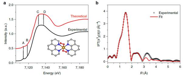 图:利用北京同步辐射装置(BSRF)获得的活性中心的原子结构。(a)通过比较XANES实验谱和理论计算谱,得到最可能的原子结构模型(插图)。(b)EXAFS谱拟合结果。