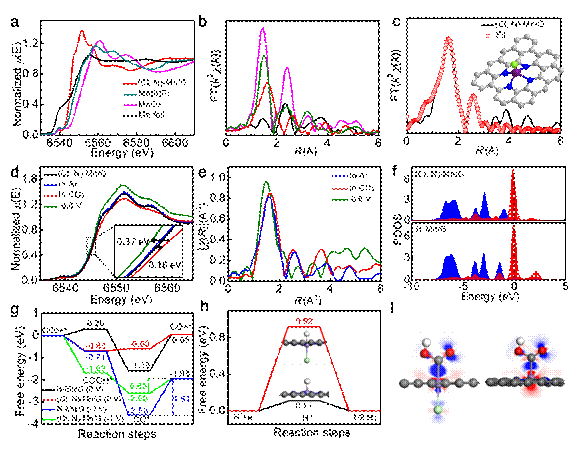 利用北京同步辐射装置(BSRF1W1B-XAFS实验站开展的X射线吸收谱分析获得活性中心锰的原子配位结构,即锰与一个氯和四个氮原子配位(图1a-c)。进一步通过在电催化过程的原位X-射线吸收谱,结合密度泛函理论计算(图1d-i),揭示了氯元素的配位可以修饰活性锰原子在催化过程中的电子结构,使催化过程的中间体形成的自由能位垒大大降低,从而大大提高了CO2的还原性能。该工作中,同步辐射技术在揭示材料深层次结构和原位跟踪催化反应方面发挥了重要作用。