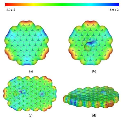 利用北京同步辐射装置(BSRF)得到的催化剂结构经DFT计算建立的静电势分布:(a)无缺陷的BN;(b)本研究合成的含缺陷的BN;(c)平面的和(d)三维的铜掺杂氮化硼(Cu-BN)的静电势分布图。(其中,白、蓝、粉、红和橙色球分别代表HNBOCu原子)
