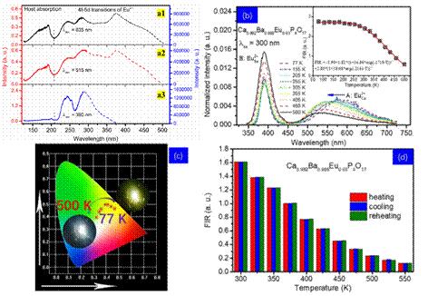 图2. (a) Ca6BaP4O17中Eu2+取代不同格位时真空紫外-紫外可见低温激发光谱;(b) 不同温度下Eu2+掺杂Ca6BaP4O17样品温度依赖的发射光谱及温度依赖荧光比例系数变化趋势;(c) 不同温度下材料发光色坐标变化趋势及对应光色照片;(d)不同温度循环阶段温度依赖荧光比例系数变化趋势。