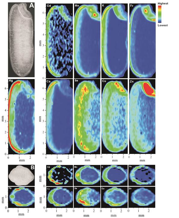 1 糙米(腹部位于右侧)中HgCdMn等元素SR-μXRF扫描图(A—纵剖面,B—横剖面)