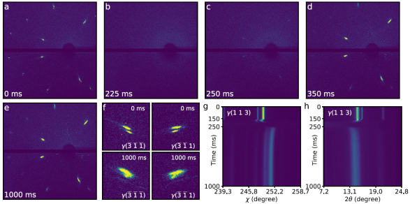 图1 镍基单晶高温合金激光快速熔凝过程中的X射线Laue衍射时间序列图谱