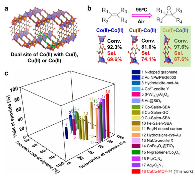 图1. CuCo-MOF-74的结构及其在空气气氛下催化苯乙烯环氧化的性能比较