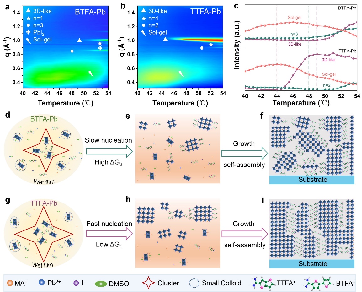 BTFA-Pb和TTFA-Pb薄膜的原位GIWAXS以及二维RP钙钛矿结晶过程的示意图