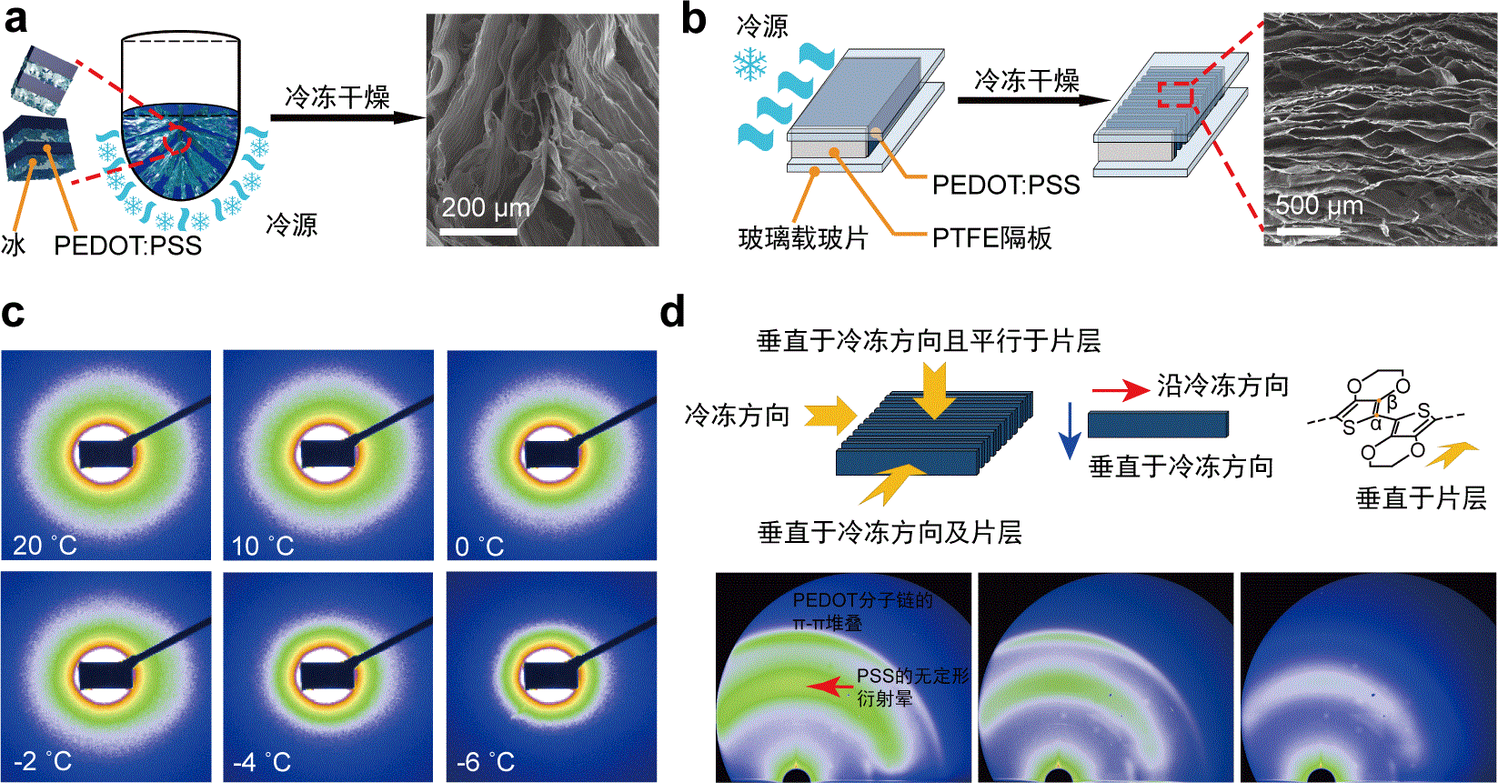 图:(a)PEDOT:PSS片层气凝胶的制备过程。(b)PEDOT:PSS片层阵列的制备过程。(c)不同温度下,PEDOT:PSS分散液的原位小角X射线散射图样。(d)PEDOT:PSS片层阵列的示意图及不同X射线入射方向时采集的二维X射线衍射图样。