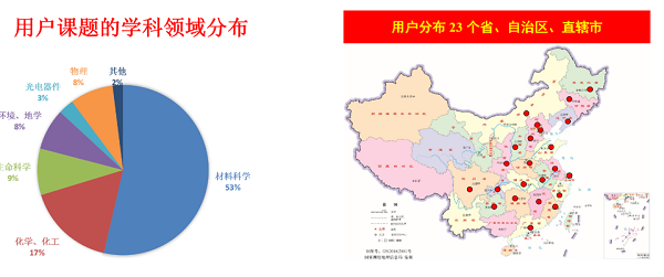 本次开放运行用户课题的学科领域分布示意图(左)及用户分布示意图(右)。