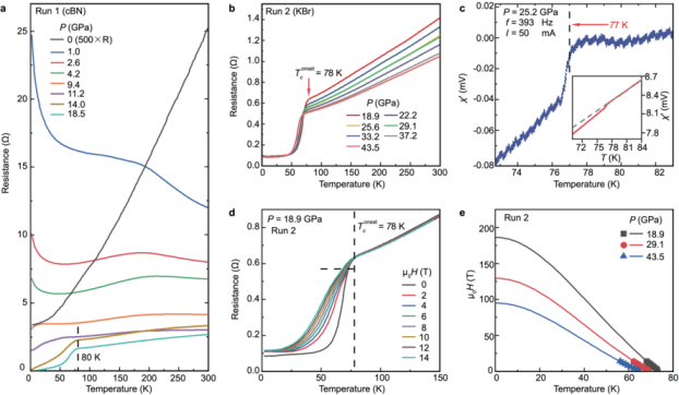 中山大学王猛教授领导的实验团队,耗时三年半,通过不断努力成功生长了镍氧化物La3Ni2O7单晶,随后在自主搭建的高压实验研究平台以及华南理工大学、北京同步辐射装置、中国科学院物理研究所开展实验研究,很快在实验上确定了此单晶材料在压力下转变为液氮温区的高温超导体,超导转变温度高达80K。