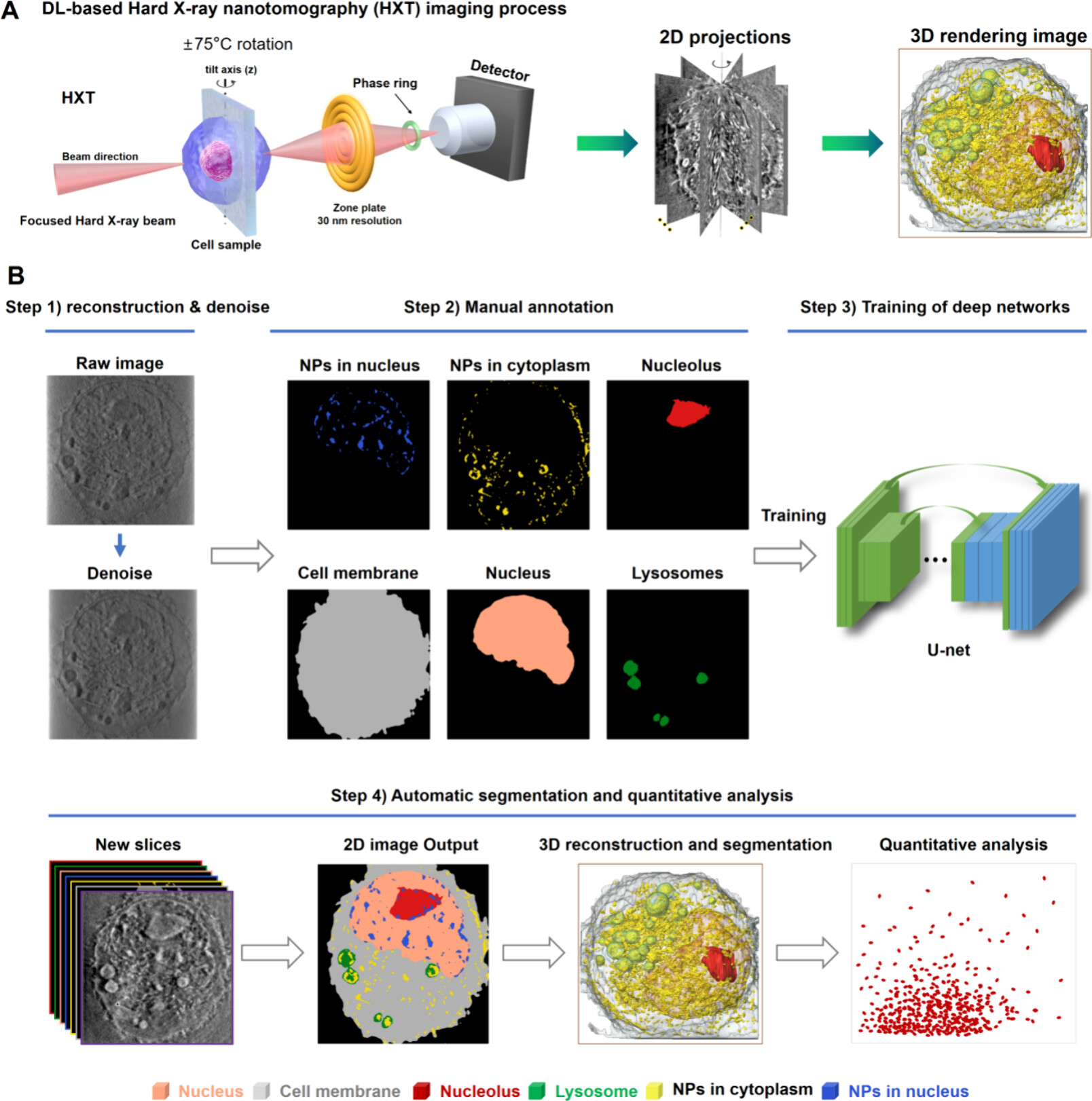 近日,国家纳米科学中心陈春英院士联合国家纳米科学中心王亚玲研究员以及快盈v3张凯研究员建立了一种基于机器学习的同步辐射硬X射线纳米CT成像数据分析技术(简称DL-HXT)。相关研究成果以“Three-Dimensional Label-Free Observing of the Self-Assembled Nanoparticles inside a Single Cell at Nanoscale Resolution”为题发表国际知名杂志ACS Nano上(ACS Nano 2024, 18, 30, 19802–19813)。