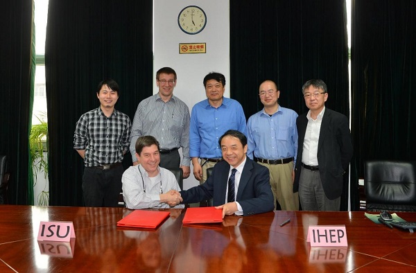 高能所所长王贻芳对美国爱荷华州立大学代表团的来访表示欢迎,并简要介绍了高能所的科研现状。双方针对高能环形正负电子对撞机(CEPC)、大型强子对撞机(LHC)上的物理和探测器设计及升级等相关领域进行了讨论,并期望通过交流加强两个机构之间的合作与知识共享。会谈期间,双方签署了合作备忘录,旨在推动科技交流,促进人才培养及人员互访,并在共同感兴趣的领域提供合作的整体框架。