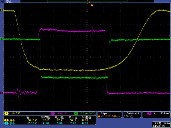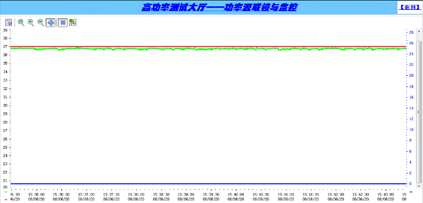 (测试期间,调制器高压为37kV,其中蓝线为连锁保护总信号(5V保护,0V正常),红线为脉冲调制器高压设定值,绿线为调制器高压采样值。)