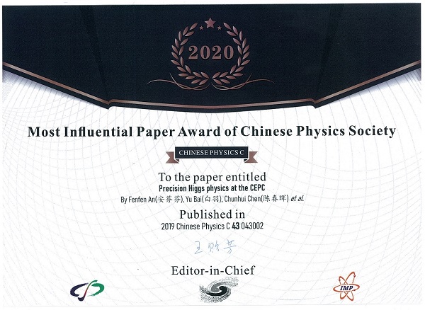 近日,环形正负电子对撞机(CEPC)物理研究团队在《Chinese Physics C》发表的论文《Precision Higgs Physics at CEPC》(Chinese Physics C, Vol. 43, NO. 4 (2019), 043002)获得中国物理学会“2020年度最有影响论文奖”。