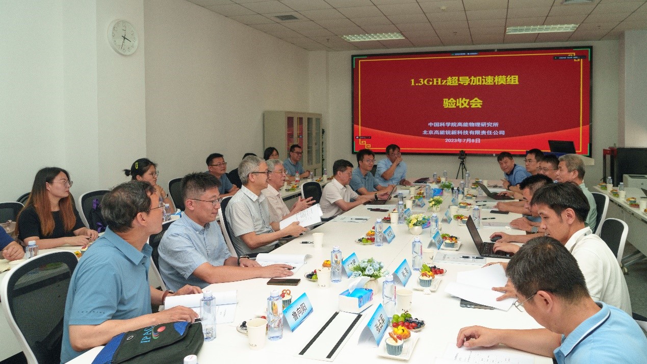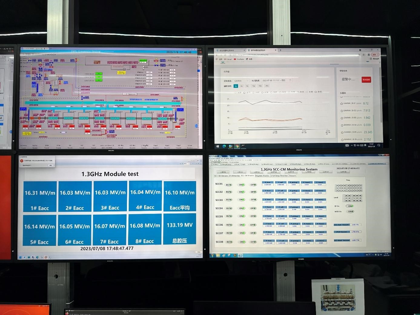 验收专家组听取了项目组做的研制和测试报告,现场见证了1.3 GHz超导加速模组升压并稳定运行在设计梯度16 MV/m(总腔压133 MV)的全过程,并进行了质询和讨论。专家组认为,项目组优质完成了合同规定的研制任务,实现了合同技术指标,模组核心指标的测试结果大幅超过了合同技术要求,超导腔平均品质因数优于国际同类模组(例如美国直线相干光源二期能量升级项目LCLS-II-HE),建议该项目通过验收。