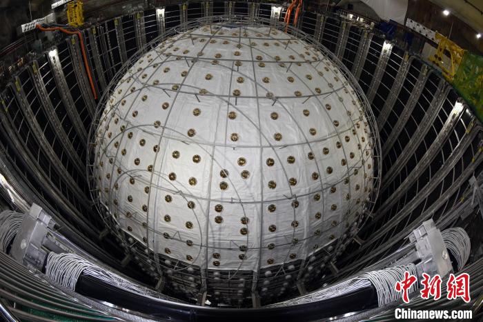 10月10日,江门中微子实验的核心探测设备——中心探测器已完成95%建设任务。中新网记者 孙自法 摄 来自建设现场的最新消息说,项目团队通过攻克一系列国际技术难题,江门中微子实验建设目前已完成95%任务进入收官阶段,预计2024年11月底完成全部设备安装任务,并启动超纯水、液体闪烁体的灌装,2025年8月正式运行取数,设计运行寿命约30年。