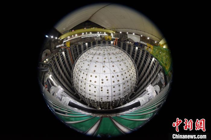 10月10日,江门中微子实验的核心探测设备——中心探测器已完成95%建设任务,图为鱼眼镜头拍摄的壮观场景。中新网记者 孙自法 摄 王贻芳认为,江门中微子实验建成后将成为国际中微子研究的中心之一,与日本的顶级神冈中微子实验、美国的深部地下中微子实验形成中微子研究三足鼎立之势,这也将使中国在中微子研究领域的国际领先地位得到进一步巩固。