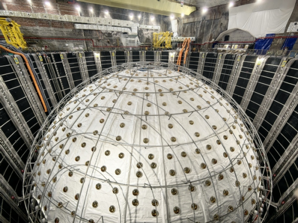 记者在江门中微子实验现场看到,目前有机玻璃球已合拢,不锈钢网架和光电倍增管也在有序合拢中,建设工作进入了收官阶段。