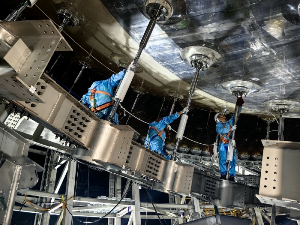 王贻芳介绍,不锈钢网壳历时5个月才安装完成。为了避免地下电焊带来的施工安全隐患和尺寸精度的不确定性,项目采用拥有自主知识产权的12万套高强螺栓拼出了不锈钢网壳。