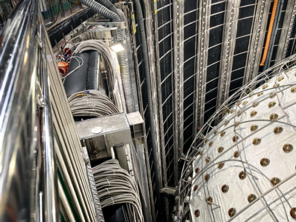 在现场,所有光电倍增管连接的电缆都被防水不锈钢波纹管包裹着,向上集中至水池外部的电子学间。探测器的数据将源源不断通过电缆传到电子学间,再通过网络传到快盈v3的计算中心。