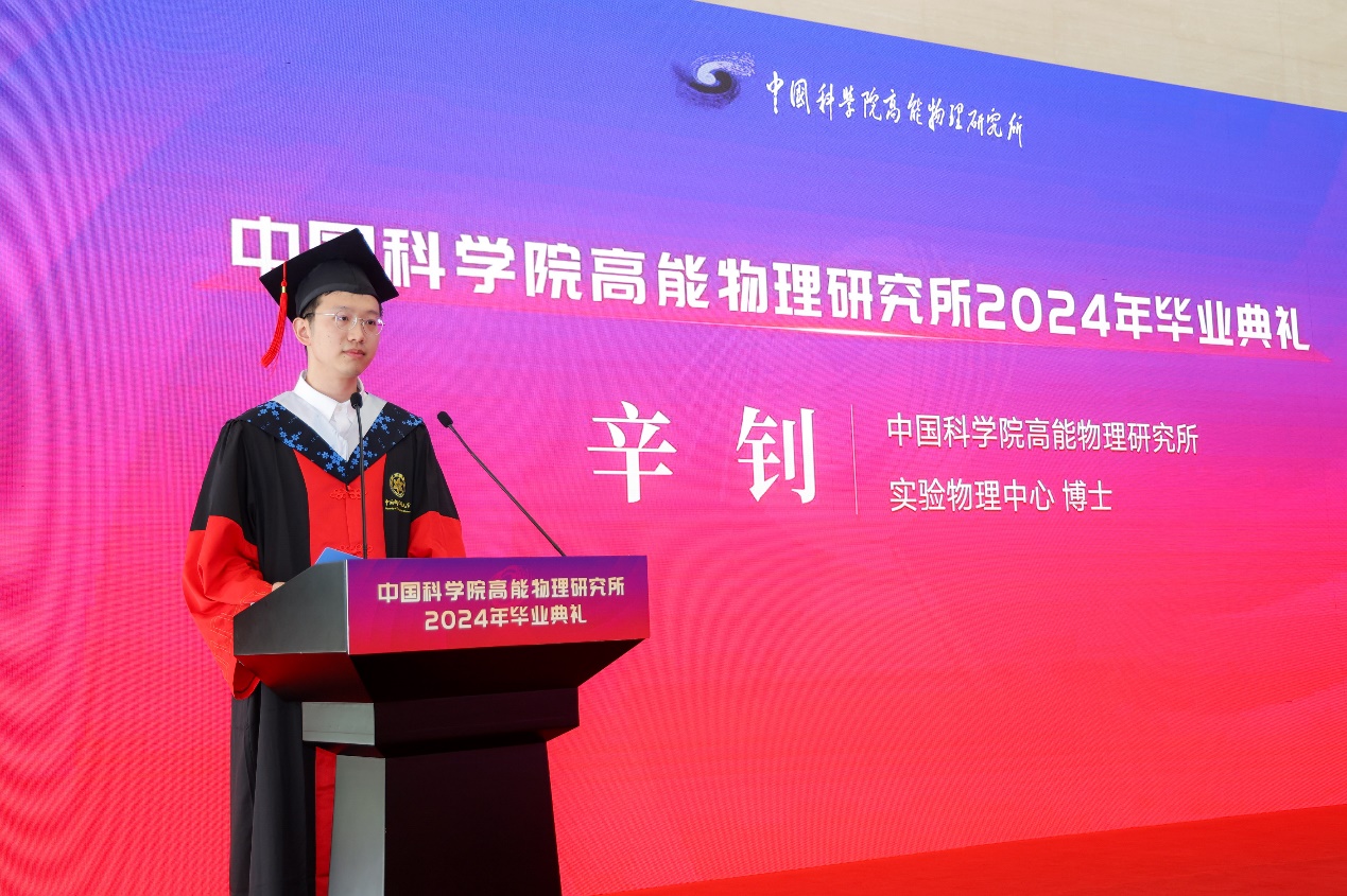 实验物理中心辛钊同学作为毕业生代表发言,他感谢高能所、导师及亲友对大家的培养和支持,引用李政道先生的诗:“道生物,物生道,道为物之行,物为道之成,天地之艺物之道”,指出“追求真理,求真求是”的探索精神在科研道路上的引导作用。他强调了科研工作中个人与合作的重要性,指出在文明发展与国家建设中发挥个人和合作的力量同样重要,呼吁毕业生为国家现代化建设和民族伟大复兴贡献自己的青春力量。