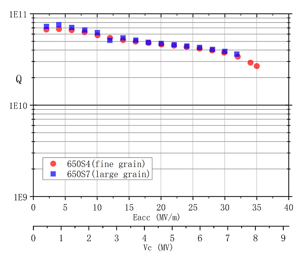 这两只650 MHz 1-cell超导腔的研发充分借鉴了之前高能所1.3 GHz超导腔研发的成功经验:650S4是一只细晶粒超导腔,采用了重化学抛光+轻电抛光的技术路线;650S7则是一只大晶粒超导腔,先采用柔性(流体)抛光处理了表面的缺陷,再进行轻电抛光处理。