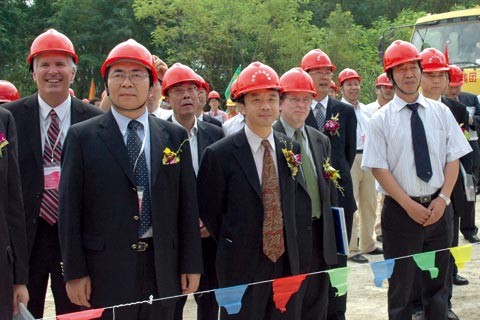 王贻芳(前排左二)与前来参加典礼的有关领导和科学家一起观看大亚湾实验站开工建设