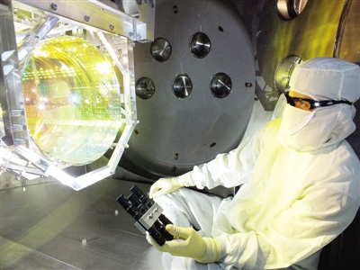 图为技术人员在关闭舱门抽制真空前检查光学部件(新华社发)