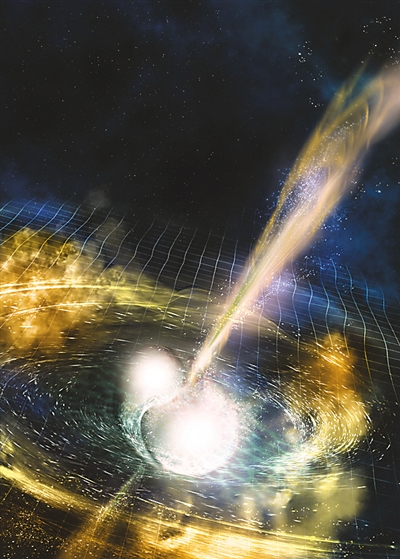 图为由美国国家科学基金会、美国“激光干涉引力波天文台”、索诺玛州立大学和A.Simonnet提供显示两个并合中的中子星效果图。新华社发