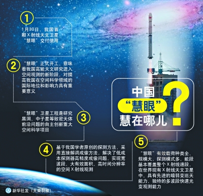 “科技创新、重大工程建设捷报频传,‘慧眼’卫星遨游太空……”国家主席习近平在2018年新年贺词中提到的“慧眼”卫星工程是研究黑洞、中子星等致密天体前沿问题的自主创新重大空间科学项目。该卫星于去年6月15日在酒泉卫星发射中心成功发射。卫星在轨运行期间,圆满完成卫星平台、有效载荷、地面应用系统等测试任务。测试结果表明,卫星各项功能、性能符合工程研制总要求,具备投入使用条件。
