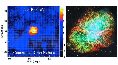 左图:西藏ASgamma实验观测到蟹状星云方向100TeV以上的伽马射线。