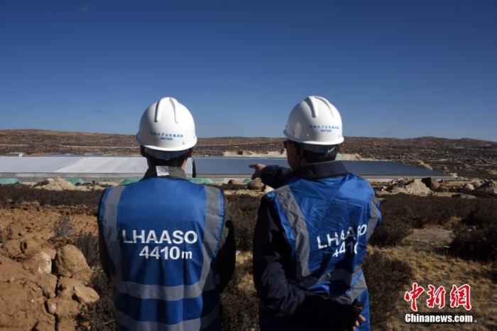 资料图:科研人员在 “拉索” 高海拔宇宙线 观测站制高点进行交流。中新社记者 孙自法 摄