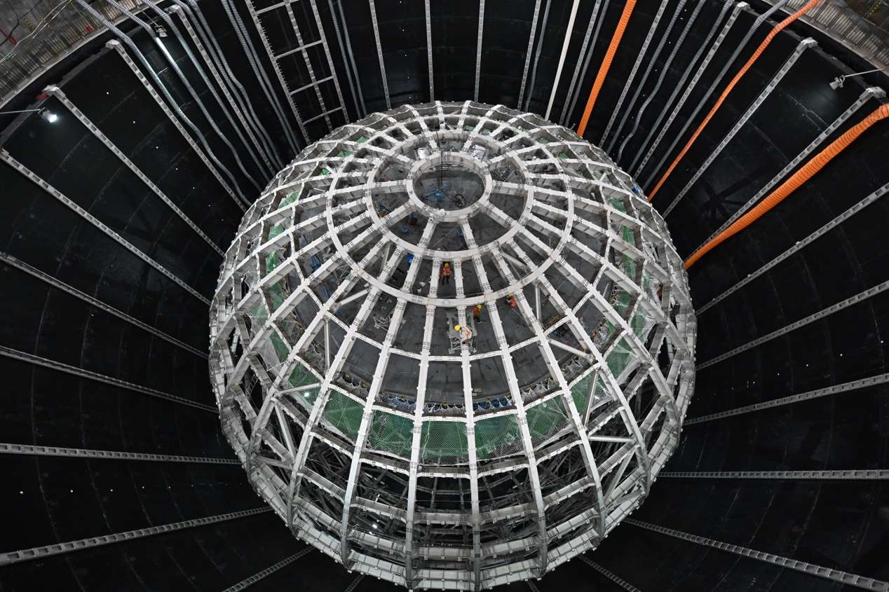 主结构安装完成后,将开始安装中心探测器结构中的有机玻璃球。据介绍,这一有机玻璃球直径为35.4米,壁厚120毫米,重600多吨,是世界上最大的单体有机玻璃结构,生产和建造在国内外都无先例。