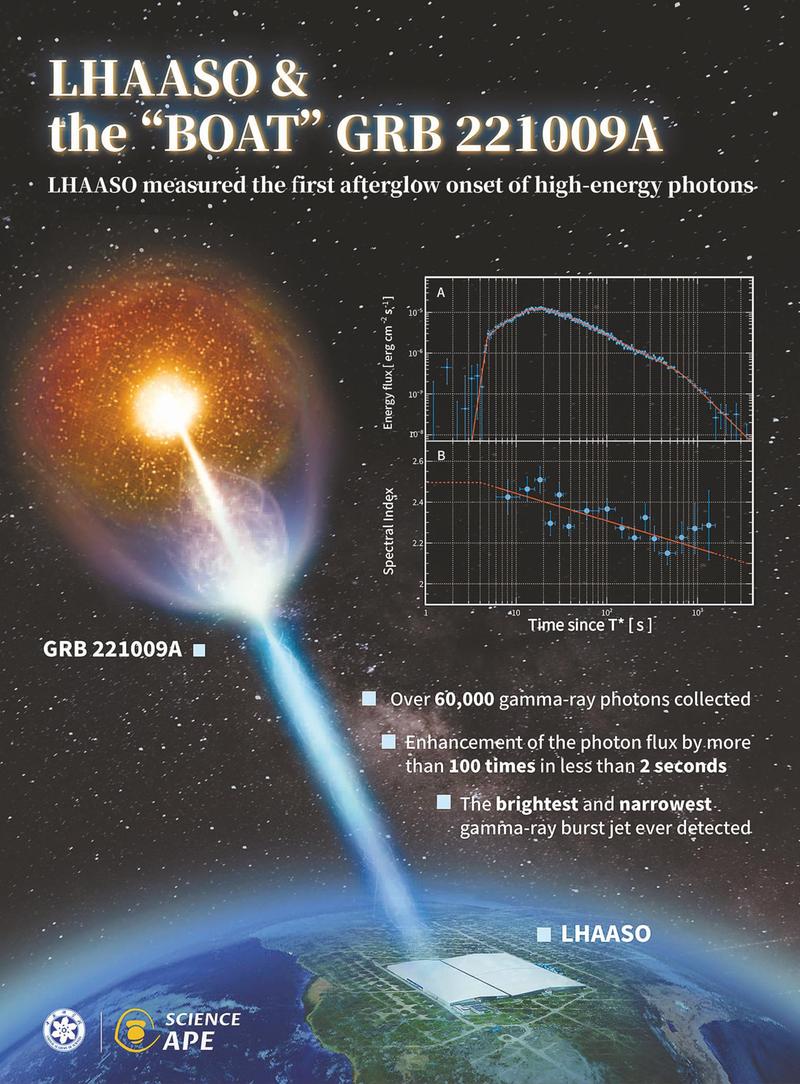 约20亿年前,一颗比太阳重20多倍的“超级太阳”大质量恒星燃烧完其核聚变燃料,瞬间坍缩引发巨大的爆炸火球,发出了一个持续几百秒的巨大“宇宙烟花”伽马射线暴(以下简称“伽马暴”)。火球与星际物质碰撞产生的大量万亿电子伏特高能伽马光子穿过茫茫宇宙,径直飞向地球,于2022年10月9日21时20分50秒抵达“拉索”的视场范围,6万多个伽马光子被位于四川稻城海子山的高海拔宇宙线观测站(LHAASO,中文简称“拉索”)收集到。经过几个月的分析,科学家们终于揭开了这场爆炸事件的面纱。