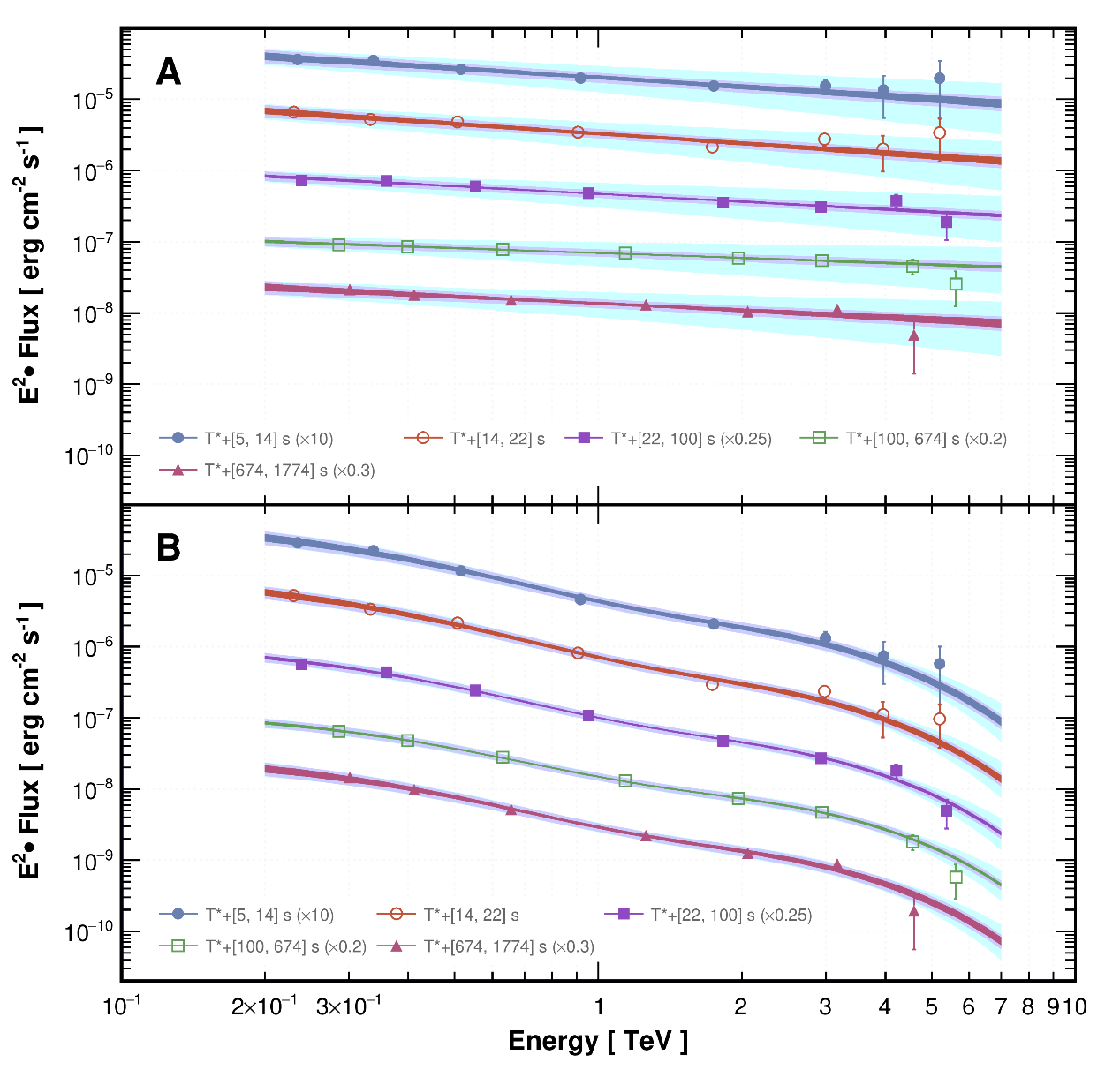 “拉索”测量得到的伽马射线暴GRB 221009A在5个时间段的本征谱与观测谱,能量范围约在2千亿到7万亿电子伏特之间。
